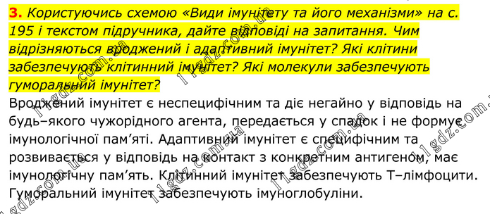 3. Користуючись схемою «Види імунітету та його механізми» на с. 195 і текстом підручника, дайте відповіді на запитання. Чим відрізняються вроджений і адаптивний імунітет? Які клітини забезпечують клітинний імунітет? Які молекули забезпечують гуморальний імунітет? Вроджений імунітет є неспецифічним та діє негайно у відповідь на будь–якого чужорідного агента, передається у спадок і не формує імунологічної пам’яті. Адаптивний імунітет є специфічним та розвивається у відповідь на контакт з конкретним антигеном, має імунологічну пам’ять. Клітинний імунітет забезпечують T–лімфоцити. Гуморальний імунітет забезпечують імуноглобуліни.