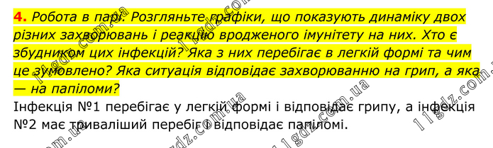 4. Робота в парі. Розгляньте графіки, що показують динаміку двох різних захворювань і реакцію вродженого імунітету на них. Хто є збудником цих інфекцій? Яка з них перебігає в легкій формі та чим це зумовлено? Яка ситуація відповідає захворюванню на грип, а яка — на папіломи? Інфекція №1 перебігає у легкій формі і відповідає грипу, а інфекція №2 має триваліший перебіг і відповідає папіломі.