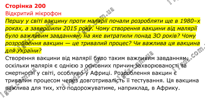 Відкритий мікрофон Першу у світі вакцину проти малярії почали розробляти ще в 1980–х роках, а завершили 2015 року. Чому створення вакцини від малярії було важливим завданням, на яке витратили понад ЗО років? Чому розроблення вакцин — це тривалий процес? Чи важлива ця вакцина для України? Створення вакцини від малярії було таким важливим завданням, оскільки малярія є однією з основних причин захворюваності та смертності у світі, особливо у Африці. Розроблення вакцин є тривалим процесом через довготривалість її тестування. Ця вакцина важлива для тих, хто подорожуватиме, наприклад, в Африку.