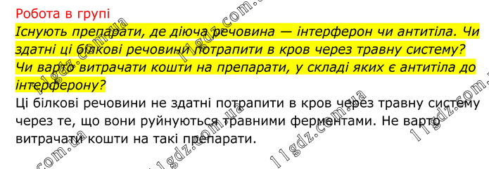 Робота в групі Існують препарати, де діюча речовина — інтерферон чи антитіла. Чи здатні ці білкові речовини потрапити в кров через травну систему? Чи варто витрачати кошти на препарати, у складі яких є антитіла до інтерферону? Ці білкові речовини не здатні потрапити в кров через травну систему через те, що вони руйнуються травними ферментами. Не варто витрачати кошти на такі препарати.
