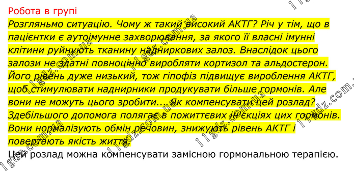 Робота в групі Розгляньмо ситуацію. Чому ж такий високий АКТГ? Річ у тім, що в пацієнтки є аутоімунне захворювання, за якого її власні імунні клітини руйнують тканину надниркових залоз. Внаслідок цього залози не здатні повноцінно виробляти кортизол та альдостерон. Його рівень дуже низький, тож гіпофіз підвищує вироблення АКТГ, щоб стимулювати наднирники продукувати більше гормонів. Але вони не можуть цього зробити... Як компенсувати цей розлад? Здебільшого допомога полягає в пожиттєвих ін'єкціях цих гормонів. Вони нормалізують обмін речовин, знижують рівень АКТГ і повертають якість життя. Цей розлад можна компенсувати замісною гормональною терапією.