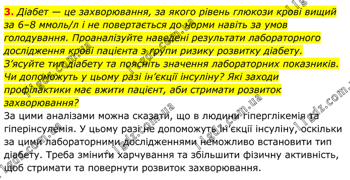 3. Діабет — це захворювання, за якого рівень глюкози крові вищий за 6–8 ммоль/л і не повертається до норми навіть за умов голодування. Проаналізуйте наведені результати лабораторного дослідження крові пацієнта з групи ризику розвитку діабету. З’ясуйте тип діабету та поясніть значення лабораторних показників. Чи допоможуть у цьому разі ін’єкції інсуліну? Які заходи профілактики має вжити пацієнт, аби стримати розвиток захворювання? За цими аналізами можна сказати, що в людини гіперглікемія та гіперінсулемія. У цьому разі не допоможуть ін’єкції інсуліну, оскільки за цими лабораторними дослідженнями неможливо встановити тип діабету. Треба змінити харчування та збільшити фізичну активність, щоб стримати та повернути розвиток захворювання.
