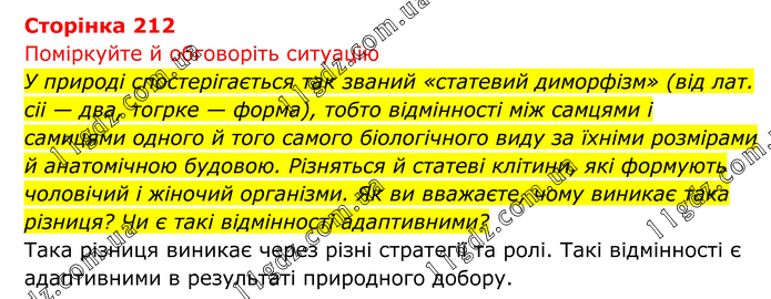 Поміркуйте й обговоріть ситуацію У природі спостерігається так званий «статевий диморфізм» (від лат. сіі — два, тогрке — форма), тобто відмінності між самцями і самицями одного й того самого біологічного виду за їхніми розмірами й анатомічною будовою. Різняться й статеві клітини, які формують чоловічий і жіночий організми. Як ви вважаєте, чому виникає така різниця? Чи є такі відмінності адаптивними? Така різниця виникає через різні стратегії та ролі. Такі відмінності є адаптивними в результаті природного добору.