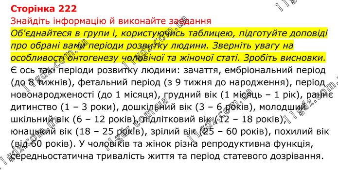 Знайдіть інформацію й виконайте завдання Об'єднайтеся в групи і, користуючись таблицею, підготуйте доповіді про обрані вами періоди розвитку людини. Зверніть увагу на особливості онтогенезу чоловічої та жіночої статі. Зробіть висновки. Є ось такі періоди розвитку людини: зачаття, ембріональний період (до 8 тижнів), фетальний період (з 9 тижня до народження), період новонародженості (до 1 місяця), грудний вік (1 місяць – 1 рік), раннє дитинство (1 – 3 роки), дошкільний вік (3 – 6 років), молодший шкільний вік (6 – 12 років), підлітковий вік (12 – 18 років), юнацький вік (18 – 25 років), зрілий вік (25 – 60 років), похилий вік (від 60 років). У чоловіків та жінок різна репродуктивна функція, середньостатична тривалість життя та період статевого дозрівання.