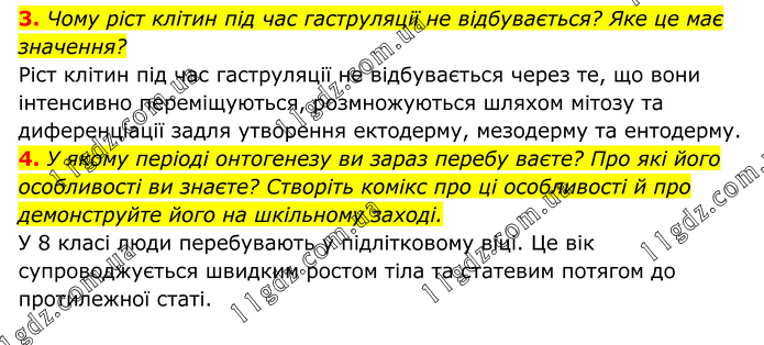 3. Чому ріст клітин під час гаструляції не відбувається? Яке це має значення? Ріст клітин під час гаструляції не відбувається через те, що вони інтенсивно переміщуються, розмножуються шляхом мітозу та диференціації задля утворення ектодерму, мезодерму та ентодерму. 4. У якому періоді онтогенезу ви зараз перебу ваєте? Про які його особливості ви знаєте? Створіть комікс про ці особливості й про демонструйте його на шкільному заході. У 8 класі люди перебувають у підлітковому віці. Це вік супроводжується швидким ростом тіла та статевим потягом до протилежної статі.