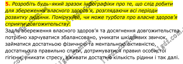 5. Розробіть будь–який зразок інфографіки про те, що слід робити для збереження власного здоров’я, розглядаючи всі періоди розвитку людини. Поміркуйте, чи може турбота про власне здоров’я сприяти довгожительству. Задля збереження власного здоров’я та досягнення довгожительства потрібно харчуватися збалансовано, уникати шкідливих звичок, займатися достатньою фізичною та ментальною активністю, достатньо та правильно спати, дотримуватися правил особистої гігієни, уникати стресу, вживати достатню кількість рідини і так далі.