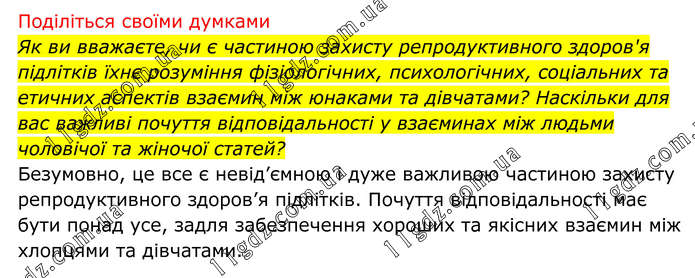Поділіться своїми думками Як ви вважаєте, чи є частиною захисту репродуктивного здоров'я підлітків їхнє розуміння фізіологічних, психологічних, соціальних та етичних аспектів взаємин між юнаками та дівчатами? Наскільки для вас важливі почуття відповідальності у взаєминах між людьми чоловічої та жіночої статей? Безумовно, це все є невід’ємною і дуже важливою частиною захисту репродуктивного здоров’я підлітків. Почуття відповідальності має бути понад усе, задля забезпечення хороших та якісних взаємин між хлопцями та дівчатами.