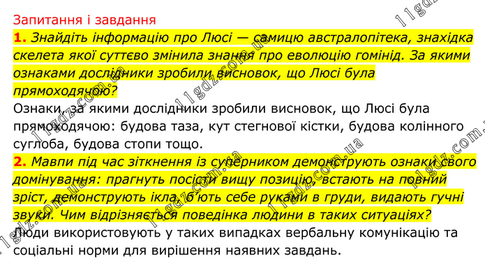 Запитання і завдання 1. Знайдіть інформацію про Люсі — самицю австралопітека, знахідка скелета якої суттєво змінила знання про еволюцію гомінід. За якими ознаками дослідники зробили висновок, що Люсі була прямоходячою? Ознаки, за якими дослідники зробили висновок, що Люсі була прямоходячою: будова таза, кут стегнової кістки, будова колінного суглоба, будова стопи тощо. 2. Мавпи під час зіткнення із суперником демонструють ознаки свого домінування: прагнуть посісти вищу позицію, встають на повний зріст, демонструють ікла, б’ють себе руками в груди, видають гучні звуки. Чим відрізняється поведінка людини в таких ситуаціях? Люди використовують у таких випадках вербальну комунікацію та соціальні норми для вирішення наявних завдань.