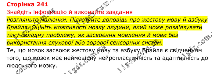 Знайдіть інформацію й виконайте завдання Розгляньте малюнки. Підготуйте доповідь про жестову мову й азбуку Брайля. Оцініть можливості мозку людини, який може розв'язувати таку складну проблему, як засвоєння мовлення й мови без використання слухової або зорової сенсорних систем. Те, що мозок засвоює жестову мову та азбуку Брайля є свідченням того, що мозок має неймовірну нейропластичність та адаптивність до людського мозку.
