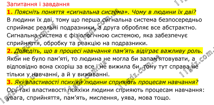 Запитання і завдання 1. Поясніть поняття «сигнальна система». Чому в людини їх дві? В людини їх дві, тому що перша сигнальна система безпосередньо сприймає реальні подразники, а друга обробляє все абстрактно. Сигнальна система є фізіологічною системою, яка забезпечує сприйняття, обробку та реакцію на подразники. 2. Доведіть, що в процесі навчання пам’ять відіграє важливу роль. Якби не було пам’яті, то людина не могла би запам’ятовувати, а відповідно вона скоріш за все і не вижила би, тому тут справа не тільки у навчанні, а й у виживанні. 3. Які властивості психіки людини сприяють процесам навчання? Ось такі властивості психіки людини сприяють процесам навчання: увага, сприйняття, пам’ять, мислення, уява, мова тощо.