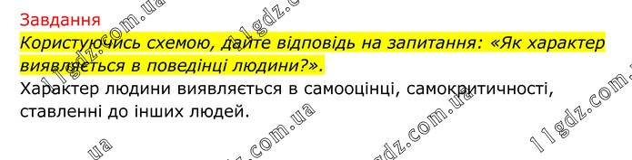 Завдання Користуючись схемою, дайте відповідь на запитання: «Як характер виявляється в поведінці людини?». Характер людини виявляється в самооцінці, самокритичності, ставленні до інших людей.
