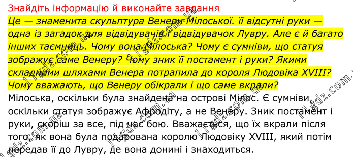 Знайдіть інформацію й виконайте завдання Це — знаменита скульптура Венери Мілоської. її відсутні руки — одна із загадок для відвідувачів і відвідувачок Лувру. Але є й багато інших таємниць. Чому вона Мілоська? Чому є сумніви, що статуя зображує саме Венеру? Чому зник її постамент і руки? Якими складними шляхами Венера потрапила до короля Людовіка XVIII? Чому вважають, що Венеру обікрали і що саме вкрали? Мілоська, оскільки була знайдена на острові Мілос. Є сумніви, оскільки статуя зображує Афродіту, а не Венеру. Зник постамент і руки, скоріш за все, під час бою. Вважається, що їх вкрали після того, як вона була подарована королю Людовіку XVIII, який потім передав її до Лувру, де вона донині і знаходиться.
