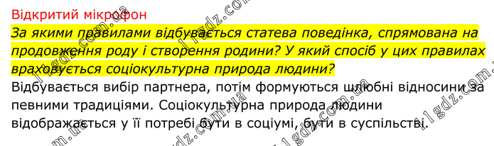 Відкритий мікрофон За якими правилами відбувається статева поведінка, спрямована на продовження роду і створення родини? У який спосіб у цих правилах враховується соціокультурна природа людини? Відбувається вибір партнера, потім формуються шлюбні відносини за певними традиціями. Соціокультурна природа людини відображається у її потребі бути в соціумі, бути в суспільстві.