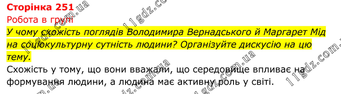 Робота в групі У чому схожість поглядів Володимира Вернадського й Маргарет Мід на соціокультурну сутність людини? Організуйте дискусію на цю тему. Схожість у тому, що вони вважали, що середовище впливає на формування людини, а людина має активну роль у світі.