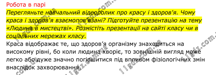 Робота в парі Перегляньте навчальний відеоролик про красу і здоров'я. Чому краса і здоров'я взаємопов'язані? Підготуйте презентацію на тему «Людина в мистецтві». Розмістіть презентації на сайті класу чи в соціальних мережах класу. Краса відображає те, що здоров’я організму знаходиться на високому рівні, бо коли людина хворіє, то зовнішній вигляд може легко або дуже значно погіршитися під впливом фізіологічних змін внаслідок захворювання.