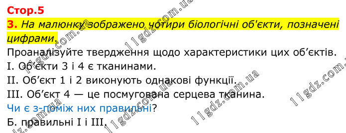 Стор.5 3. На малюнку зображено чотири біологічні об'єкти, позначені цифрами. Проаналізуйте твердження щодо характеристики цих об’єктів. I. Об’єкти 3 і 4 є тканинами. II. Об’єкт 1 і 2 виконують однакові функції. III. Об’єкт 4 — це посмугована серцева тканина. Чи є з-поміж них правильні? Б. правильні І і III.