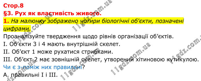 Стор.8 §3. Рух як властивість живого. 1. На малюнку зображено чотири біологічні об'єкти, позначені цифрами. Проаналізуйте твердження щодо рівнів організації об’єктів. I. Об’єкти 3 і 4 мають внутрішній скелет. II. Об’єкт 1 може рухатися стрибками. III. Об’єкт 2 має зовнішній скелет, утворений хітиновою кутикулою. Чи є з-поміж них правильні? А. правильні І і III.