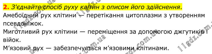 2. З'єднайте спосіб руху клітин з описом його здійснення. Амебоїдний рух клітини — перетікання цитоплазми з утворенням псевдоніжок. Миготливий рух клітини — переміщення за допомогою джгутиків і війок. М’язовий рух — забезпечується м’язовими клітинами.