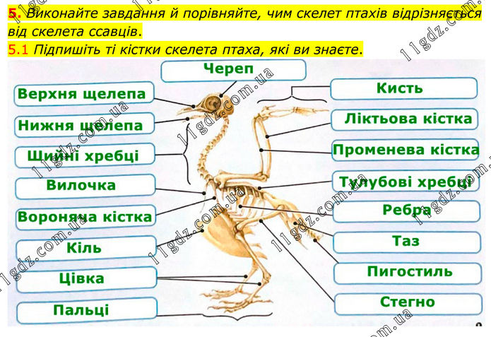 5. Виконайте завдання й порівняйте, чим скелет птахів відрізняється від скелета ссавців. 5.1 Підпишіть ті кістки скелета птаха, які ви знаєте.