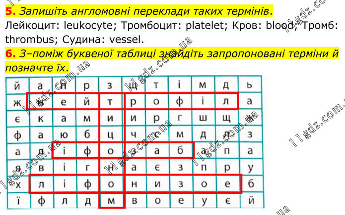 5. Запишіть англомовні переклади таких термінів. Лейкоцит: leukocyte; Тромбоцит: platelet; Кров: blood; Тромб: thrombus; Судина: vessel. 6. З–поміж буквеної таблиці знайдіть запропоновані терміни й позначте їх.