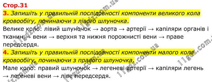 3. Запишіть у правильній послідовності компоненти великого кола кровообігу, починаючи з лівого шлуночка. Велике коло: лівий шлуночок → аорта → артерії → капіляри органів і тканин → вени → верхня та нижня порожнисті вени → праве передсердя. 4. Запишіть у правильній послідовності компоненти малого кола кровообігу, починаючи з правого шлуночка. Мале коло: правий шлуночок → легеневі артерії → капіляри легень → легеневі вени → ліве передсердя.