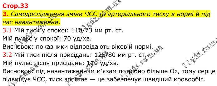 3. Самодослідження зміни ЧСС та артеріального тиску в нормі й під час навантаження. 3.1 Мій тиск у спокої: 110/73 мм рт. ст. Мій пульс у спокої: 70 уд/хв. Висновок: показники відповідають віковій нормі. 3.2 Мій тиск після присідань: 125/80 мм рт. ст. Мій пульс після присідань: 110 уд/хв. Висновок: під навантаженням м’язам потрібно більше O₂, тому серце підвищує ЧСС, тиск зростає — це забезпечує швидший кровообіг.