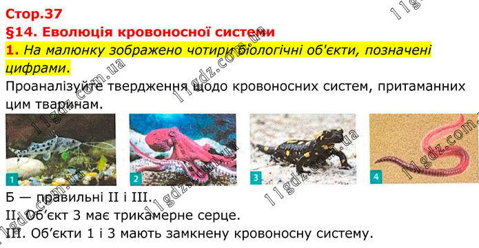 §14. Еволюція кровоносної системи 1. На малюнку зображено чотири біологічні об'єкти, позначені цифрами. Проаналізуйте твердження щодо кровоносних систем, притаманних цим тваринам. Б — правильні II і III. II. Об’єкт 3 має трикамерне серце. III. Об’єкти 1 і 3 мають замкнену кровоносну систему.