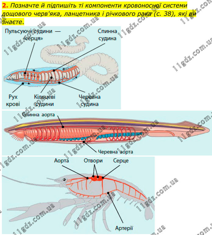 2. Позначте й підпишіть ті компоненти кровоносної системи дощового черв'яка, ланцетника і річкового рака (с. 38), які ви знаєте.