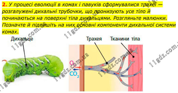 2. У процесі еволюції в комах і павуків сформувалися трахеї — розгалужені дихальні трубочки, що пронизують усе тіло й починаються на поверхні тіла дихальцями. Розгляньте малюнки. Позначте й підпишіть на них основні компоненти дихальної системи комах.