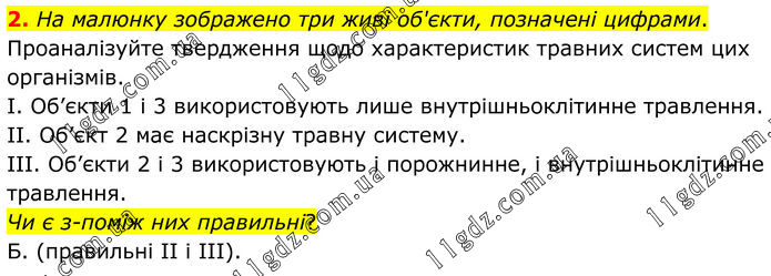 2. На малюнку зображено три живі об'єкти, позначені цифрами. Проаналізуйте твердження щодо характеристик травних систем цих організмів. I. Об’єкти 1 і 3 використовують лише внутрішньоклітинне травлення. II. Об’єкт 2 має наскрізну травну систему. III. Об’єкти 2 і 3 використовують і порожнинне, і внутрішньоклітинне травлення. Чи є з-поміж них правильні? Б. (правильні ІІ і ІІІ).