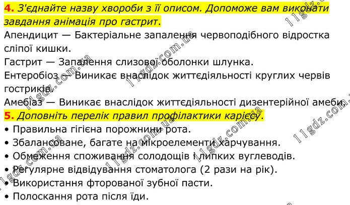 4. З'єднайте назву хвороби з її описом. Допоможе вам виконати завдання анімація про гастрит. Апендицит — Бактеріальне запалення червоподібного відростка сліпої кишки. Гастрит — Запалення слизової оболонки шлунка. Ентеробіоз — Виникає внаслідок життєдіяльності круглих червів гостриків. Амебіаз — Виникає внаслідок життєдіяльності дизентерійної амеби. 5. Доповніть перелік правил профілактики карієсу. • Правильна гігієна порожнини рота. • Збалансоване, багате на мікроелементи харчування. • Обмеження споживання солодощів і липких вуглеводів. • Регулярне відвідування стоматолога (2 рази на рік). • Використання фторованої зубної пасти. • Полоскання рота після їди.