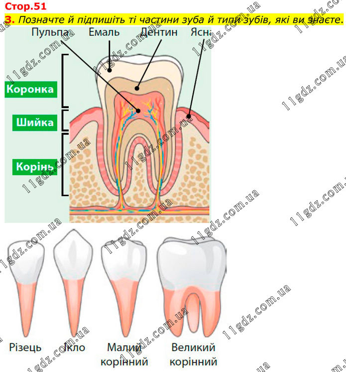 З. Позначте й підпишіть ті частини зуба й типи зубів, які ви знаєте.
