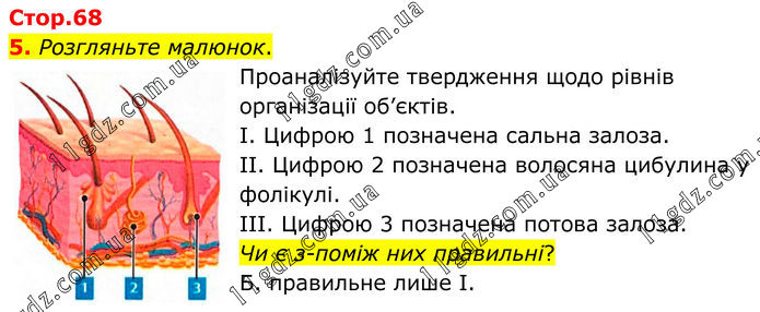 5. Розгляньте малюнок. Проаналізуйте твердження щодо рівнів організації об’єктів. I. Цифрою 1 позначена сальна залоза. II. Цифрою 2 позначена волосяна цибулина у фолікулі. III. Цифрою 3 позначена потова залоза. Чи є з-поміж них правильні? Б. правильне лише І.