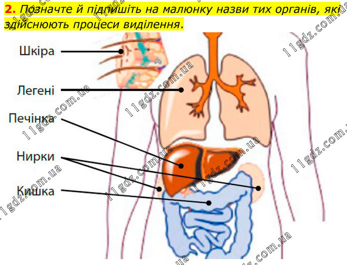 2. Позначте й підпишіть на малюнку назви тих органів, які здійснюють процеси виділення.