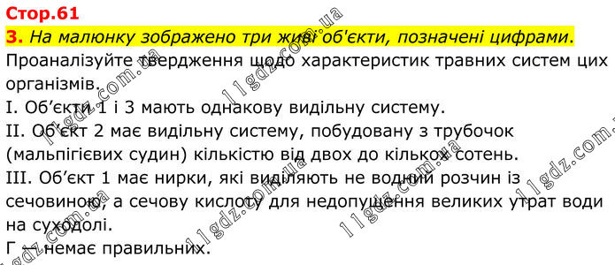 3. На малюнку зображено три живі об'єкти, позначені цифрами. Проаналізуйте твердження щодо характеристик травних систем цих організмів. I. Об’єкти 1 і 3 мають однакову видільну систему. II. Об’єкт 2 має видільну систему, побудовану з трубочок (мальпігієвих судин) кількістю від двох до кількох сотень. III. Об’єкт 1 має нирки, які виділяють не водний розчин із сечовиною, а сечову кислоту для недопущення великих утрат води на суходолі. Г — немає правильних.
