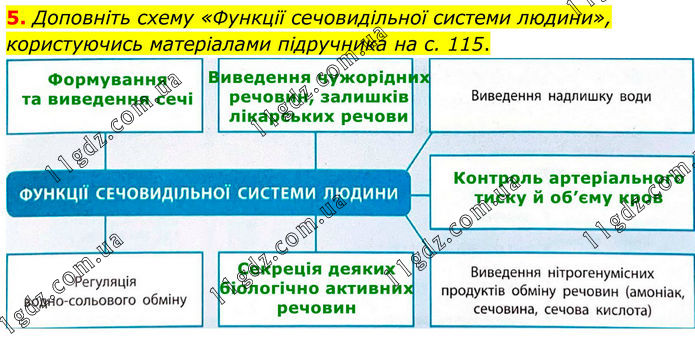 5. Доповніть схему «Функції сечовидільної системи людини», користуючись матеріалами підручника на с. 115.