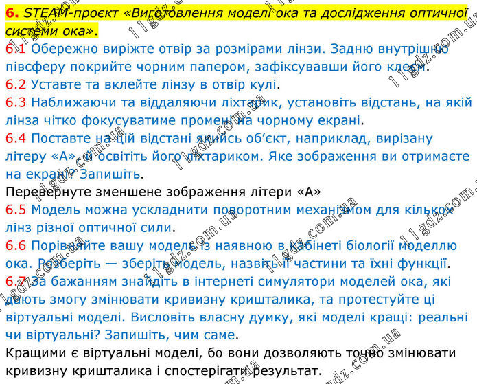 6. STEAM-проєкт «Виготовлення моделі ока та дослідження оптичної системи ока». 6.1 Обережно виріжте отвір за розмірами лінзи. Задню внутрішню півсферу покрийте чорним папером, зафіксувавши його клеєм. 6.2 Уставте та вклейте лінзу в отвір кулі. 6.3 Наближаючи та віддаляючи ліхтарик, установіть відстань, на якій лінза чітко фокусуватиме промені на чорному екрані. 6.4 Поставте на цій відстані якийсь об’єкт, наприклад, вирізану літеру «А», й освітіть його ліхтариком. Яке зображення ви отримаєте на екрані? Запишіть. Перевернуте зменшене зображення літери «А» 6.5 Модель можна ускладнити поворотним механізмом для кількох лінз різної оптичної сили. 6.6 Порівняйте вашу модель із наявною в кабінеті біології моделлю ока. Розберіть — зберіть модель, назвіть її частини та їхні функції. 6.7 За бажанням знайдіть в інтернеті симулятори моделей ока, які дають змогу змінювати кривизну кришталика, та протестуйте ці віртуальні моделі. Висловіть власну думку, які моделі кращі: реальні чи віртуальні? Запишіть, чим саме. Кращими є віртуальні моделі, бо вони дозволяють точно змінювати кривизну кришталика і спостерігати результат.