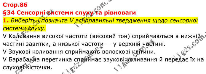 §34 Сенсорні системи слуху та рівноваги 1. Виберіть і позначте V всі правильні твердження щодо сенсорної системи слуху. V Коливання високої частоти (високий тон) сприймаються в нижній частині завитки, а низької частоти — у верхній частині. V Звукові коливання сприймають волоскові клітини. V Барабанна перетинка сприймає звукові коливання й передає їх на слухові кісточки.
