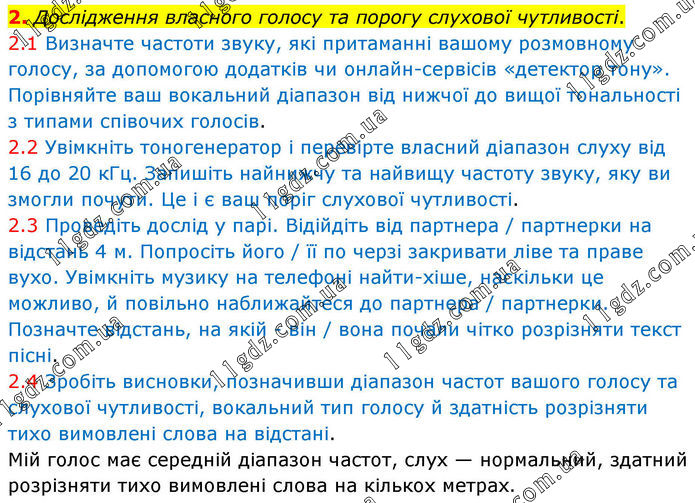 2. Дослідження власного голосу та порогу слухової чутливості. 2.1 Визначте частоти звуку, які притаманні вашому розмовному голосу, за допомогою додатків чи онлайн-сервісів «детектор тону». Порівняйте ваш вокальний діапазон від нижчої до вищої тональності з типами співочих голосів. 2.2 Увімкніть тоногенератор і перевірте власний діапазон слуху від 16 до 20 кГц. Запишіть найнижчу та найвищу частоту звуку, яку ви змогли почути. Це і є ваш поріг слухової чутливості. 2.3 Проведіть дослід у парі. Відійдіть від партнера / партнерки на відстань 4 м. Попросіть його / її по черзі закривати ліве та праве вухо. Увімкніть музику на телефоні найти-хіше, наскільки це можливо, й повільно наближайтеся до партнера / партнерки. Позначте відстань, на якій - він / вона почали чітко розрізняти текст пісні. 2.4 Зробіть висновки, позначивши діапазон частот вашого голосу та слухової чутливості, вокальний тип голосу й здатність розрізняти тихо вимовлені слова на відстані. Мій голос має середній діапазон частот, слух — нормальний, здатний розрізняти тихо вимовлені слова на кількох метрах.