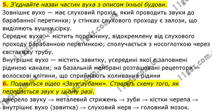 5. З'єднайте назви частин вуха з описом їхньої будови. Зовнішнє вухо — має слуховий прохід, який проводить звуки до барабанної перетинки; у стінках слухового проходу є залози, що виділяють вушну сірку. Середнє вухо — містить порожнину, відокремлену від слухового проходу барабанною перетинкою; сполучається з носоглоткою через євстахієву трубу. Внутрішнє вухо — містить завитку, усередині якої є заповнені рідиною канали; на базальній мембрані розташовані рецептори — волоскові клітини, що сприймають коливання рідини. 6. Подивіться відео «Звук зубами». Створіть схему того, як передається звук у цьому разі. джерело звуку → металевий стрижень → зуби → кістки черепа → внутрішнє вухо (завитка) → слуховий нерв → головний мозок.