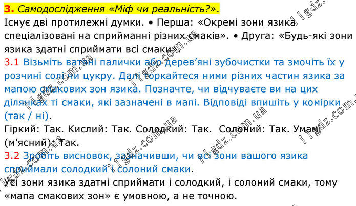 З. Самодослідження «Міф чи реальність?». Існує дві протилежні думки. • Перша: «Окремі зони язика спеціалізовані на сприйманні різних смаків». • Друга: «Будь-які зони язика здатні сприймати всі смаки». 3.1 Візьміть ватяні палички або дерев’яні зубочистки та змочіть їх у розчині солі чи цукру. Далі торкайтеся ними різних частин язика за мапою смакових зон язика. Позначте, чи відчуваєте ви на цих ділянках ті смаки, які зазначені в мапі. Відповіді впишіть у комірки (так / ні). Гіркий: Так. Кислий: Так. Солодкий: Так. Солоний: Так. Умамі (м’ясний): Так. 3.2 Зробіть висновок, зазначивши, чи всі зони вашого язика сприймали солодкий і солоний смаки. Усі зони язика здатні сприймати і солодкий, і солоний смаки, тому «мапа смакових зон» є умовною, а не точною.