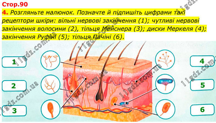 4. Розгляньте малюнок. Позначте й підпишіть цифрами такі рецептори шкіри: вільні нервові закінчення (1); чутливі нервові закінчення волосини (2), тільця Мейснера (3); диски Меркеля (4); закінчення Руфіні (5); тільця Пачіні (6).