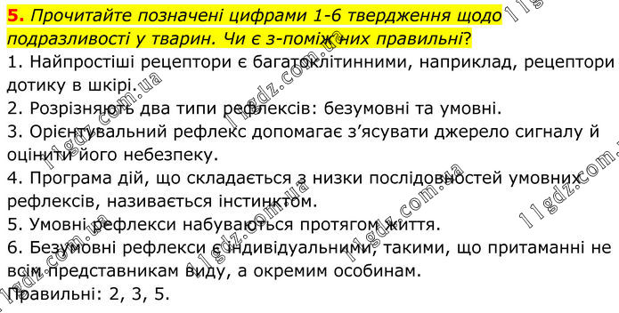 5. Прочитайте позначені цифрами 1-6 твердження щодо подразливості у тварин. Чи є з-поміж них правильні? 1. Найпростіші рецептори є багатоклітинними, наприклад, рецептори дотику в шкірі. 2. Розрізняють два типи рефлексів: безумовні та умовні. 3. Орієнтувальний рефлекс допомагає з’ясувати джерело сигналу й оцінити його небезпеку. 4. Програма дій, що складається з низки послідовностей умовних рефлексів, називається інстинктом. 5. Умовні рефлекси набуваються протягом життя. 6. Безумовні рефлекси є індивідуальними, такими, що притаманні не всім представникам виду, а окремим особинам. Правильні: 2, 3, 5.