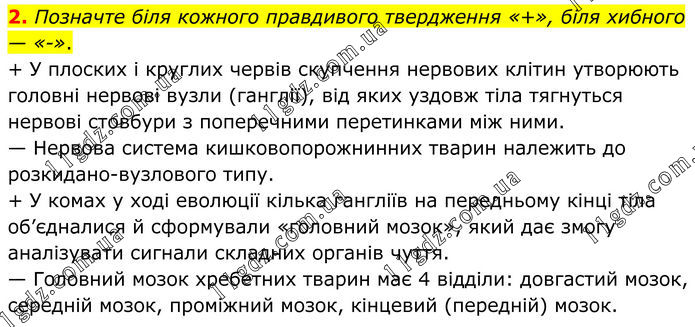 2. Позначте біля кожного правдивого твердження «+», біля хибного — «-». + У плоских і круглих червів скупчення нервових клітин утворюють головні нервові вузли (ганглії), від яких уздовж тіла тягнуться нервові стовбури з поперечними перетинками між ними. — Нервова система кишковопорожнинних тварин належить до розкидано-вузлового типу. + У комах у ході еволюції кілька гангліїв на передньому кінці тіла об’єдналися й сформували «головний мозок», який дає змогу аналізувати сигнали складних органів чуття. — Головний мозок хребетних тварин має 4 відділи: довгастий мозок, середній мозок, проміжний мозок, кінцевий (передній) мозок.