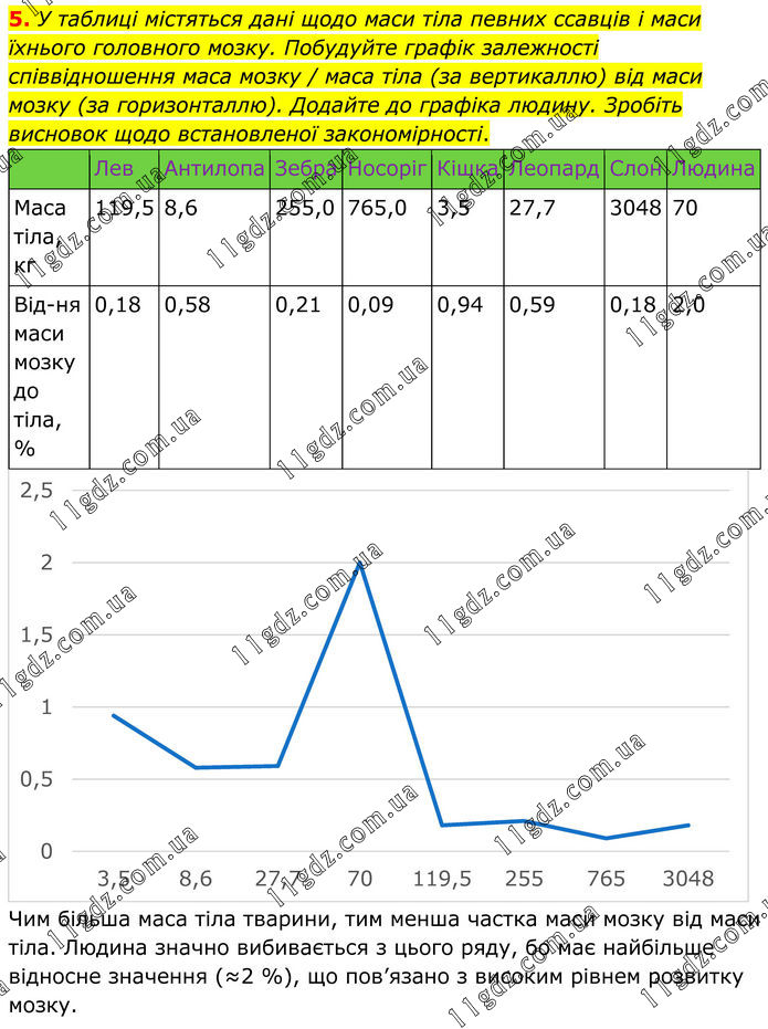5. У таблиці містяться дані щодо маси тіла певних ссавців і маси їхнього головного мозку. Побудуйте графік залежності співвідношення маса мозку / маса тіла (за вертикаллю) від маси мозку (за горизонталлю). Додайте до графіка людину. Зробіть висновок щодо встановленої закономірності. Чим більша маса тіла тварини, тим менша частка маси мозку від маси тіла. Людина значно вибивається з цього ряду, бо має найбільше відносне значення (≈2 %), що пов’язано з високим рівнем розвитку мозку.