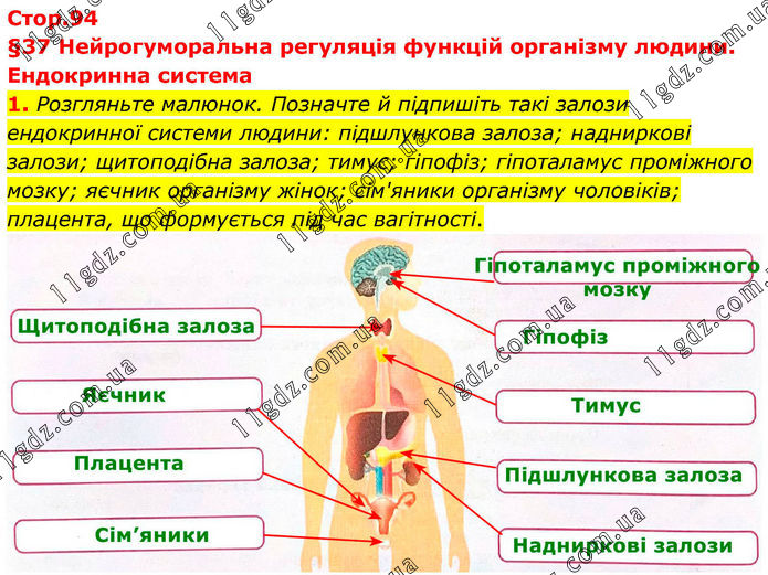 §37 Нейрогуморальна регуляція функцій організму людини. Ендокринна система 1. Розгляньте малюнок. Позначте й підпишіть такі залози ендокринної системи людини: підшлункова залоза; надниркові залози; щитоподібна залоза; тимус; гіпофіз; гіпоталамус проміжного мозку; яєчник організму жінок; сім'яники організму чоловіків; плацента, що формується під час вагітності.