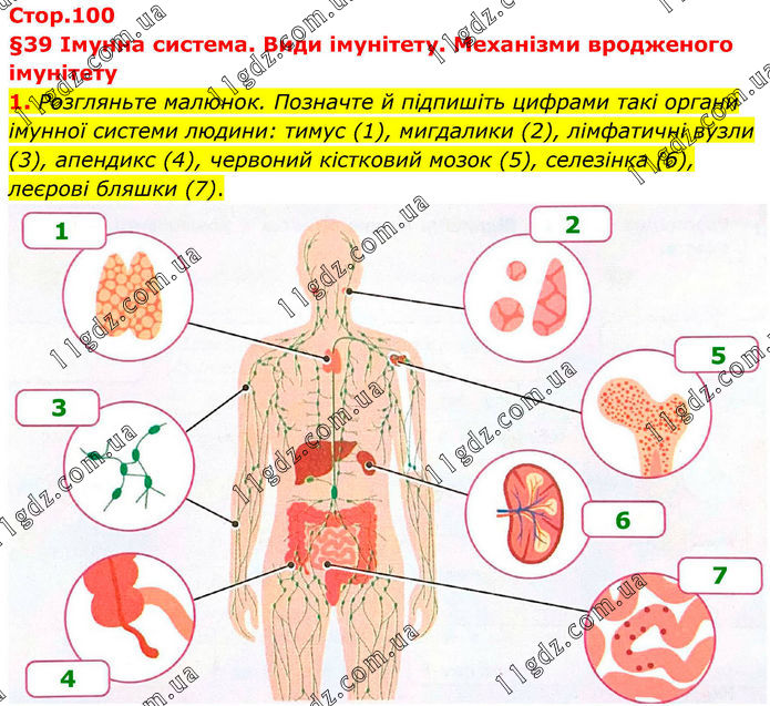 §39 Імунна система. Види імунітету. Механізми вродженого імунітету 1. Розгляньте малюнок. Позначте й підпишіть цифрами такі органи імунної системи людини: тимус (1), мигдалики (2), лімфатичні вузли (3), апендикс (4), червоний кістковий мозок (5), селезінка (б), леєрові бляшки (7).