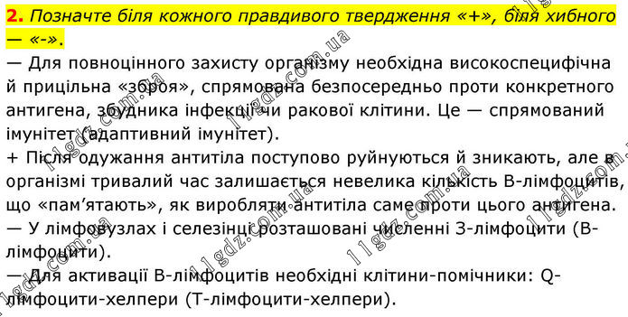 2. Позначте біля кожного правдивого твердження «+», біля хибного — «-». — Для повноцінного захисту організму необхідна високоспецифічна й прицільна «зброя», спрямована безпосередньо проти конкретного антигена, збудника інфекції чи ракової клітини. Це — спрямований імунітет (адаптивний імунітет). + Після одужання антитіла поступово руйнуються й зникають, але в організмі тривалий час залишається невелика кількість В-лімфоцитів, що «пам’ятають», як виробляти антитіла саме проти цього антигена. — У лімфовузлах і селезінці розташовані численні З-лімфоцити (В-лімфоцити). — Для активації В-лімфоцитів необхідні клітини-помічники: Q-лімфоцити-хелпери (Т-лімфоцити-хелпери).