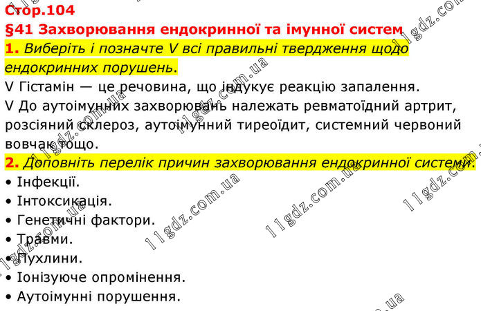 §41 Захворювання ендокринної та імунної систем 1. Виберіть і позначте V всі правильні твердження щодо ендокринних порушень. V Гістамін — це речовина, що індукує реакцію запалення. V До аутоімунних захворювань належать ревматоїдний артрит, розсіяний склероз, аутоімунний тиреоїдит, системний червоний вовчак тощо. 2. Доповніть перелік причин захворювання ендокринної системи. • Інфекції. • Інтоксикація. • Генетичні фактори. • Травми. • Пухлини. • Іонізуюче опромінення. • Аутоімунні порушення.
