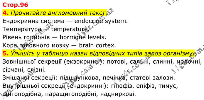 4. Прочитайте англомовний текст. Ендокринна система — endocrine system. Температура — temperature. Рівень гормонів — hormone levels. Кора головного мозку — brain cortex. 5. Упишіть у таблицю назви відповідних типів залоз організму. Зовнішньої секреції (екзокринні): потові, сальні, слинні, молочні, сірчані, слізні. Змішаної секреції: підшлункова, печінка, статеві залози. Внутрішньої секреції (ендокринні): гіпофіз, епіфіз, тимус, щитоподібна, паращитоподібні, надниркові.